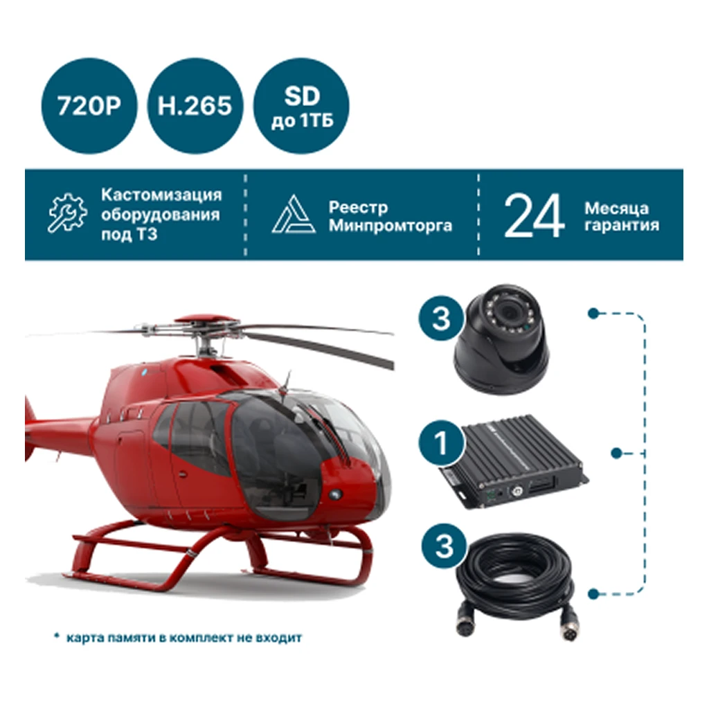 Надежный комплект видеонаблюдения NSCAR ST301_SD предназначен для установки на воздушный транспорт, включая технику и спецсредства МЧС. Система включает видеорегистратор с записью на SD-карту и поддержкой до 3 камер, обеспечивая полноценный контроль происходящего в салоне и снаружи. Устройство работает в широком диапазоне температур и устойчиво к вибрациям, что делает его идеальным для эксплуатации в экстремальных условиях.
